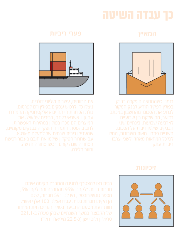 "מה שהדהים אותי במה שהם עשו הוא שבפעם הראשונה ראיתי איך מישהו הופך את השיטה", אומר לי אדם שעבד לפני 30 שנה אצל השניים במשרדיהם בפולין. "אף אחד לא מתעסק עם הבנק ואנחנו רגילים שהוא חזק מאיתנו, ופה באו שני צעירים והפכו את הפירמידה ואמרו 'אנחנו הבנק', ומי שהתחיל לשלם ריבית מטורפת זה לא הלקוח, אלא הבנקים. אנחנו לא מתפלאים כשהבנק מתעשר על חשבון הלקוח, אבל פה זה היה הפוך".