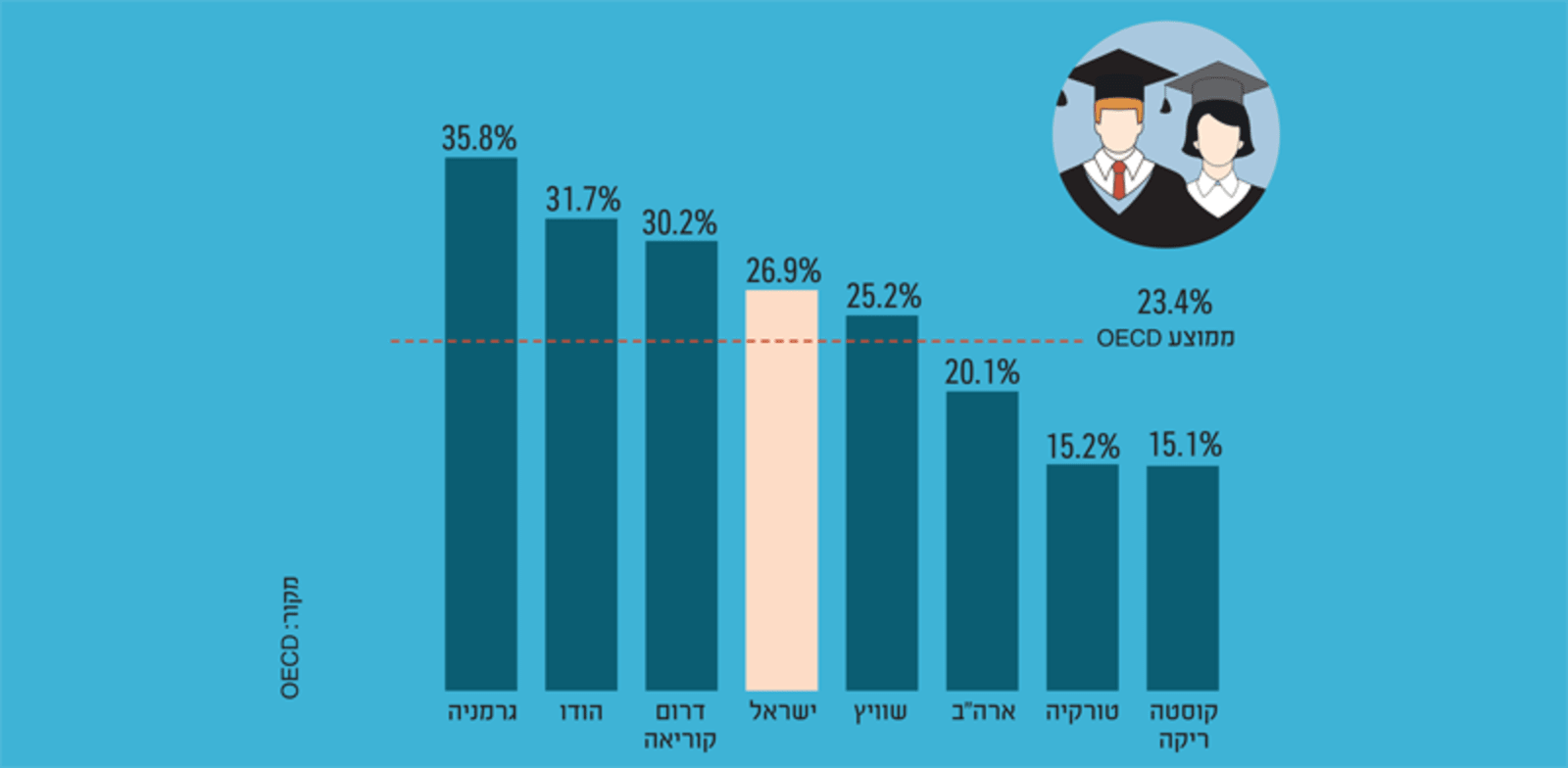 ישראל נחשבת למדינה מרובת תארים ונמצאת מעל ממוצע ה־OECD בשיעור בעלי ההשכלה הגבוהה (50% מבני 25־64 מחזיקים בתואר ראשון, לעומת 40% ב־OECD). אך לא מדובר רק בתארים לשם התואר - 25% מהתארים הראשונים בישראל נעשים במקצועות ה־STEM (מדע, טכנולוגיה, הנדסה ומתמטיקה), וגם נתון זה גבוה מממוצע ה־OECD. בסופו של דבר, לימוד מקצועות אלה קריטי להתפתחות הכלכלית ולחדשנות, ובפרט לענף ההייטק.