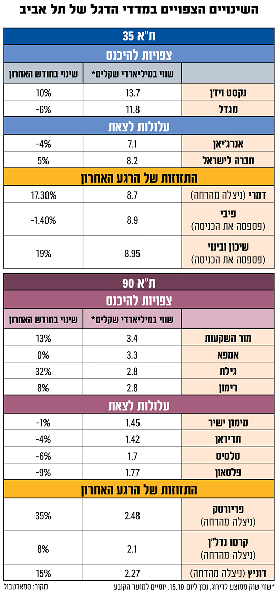 בעקבות עלייתן של השתיים, שתי החברות הקטנות ביותר במדד ת"א 35 מבחינת שווי יפנו את מקומן ויירדו לת"א 90. מדובר באנרג'יאן , חברת הגז היוונית-בריטית שמחזיקה במאגר הגז כריש, שתצא מהמדד כשהיא בשווי ממוצע לתקופה הקובעת של 7.1 מיליארד שקל והחברה לישראל של עידן עופר, ששולטת בחברת המינרלים והכימיקלים איי.סי.אל. זו תצא מהמדד כששווי שוק שלה 8.2 מיליארד שקל.