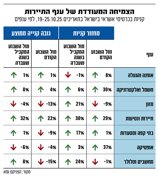 נתון חיובי נוסף מגיע מענף התיירות והנסיעות, שמציג עלייה של כ־29% במחזורי הקניות לעומת השבוע הקודם, וצמיחה של כ־30% לעומת השבוע המקביל אשתקד - וזאת למרות חוסר הוודאות הכלכלית.