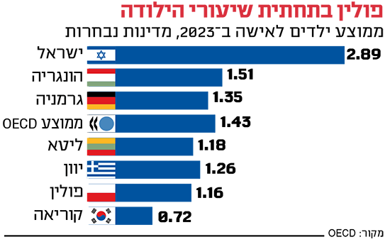 בעבור פולין שיעורי הילודה של ישראל - שהם חריגים בגובהם גם במדינות ה־OECD - הם חלום פוליטי וכלכלי של ממש. המדינה סובלת ממשבר חמור: רק 250 אלף תינוקות נולדו במדינה בשנה שעברה, לעומת 180 אלף תינוקות בישראל בתקופה המקבילה. האוכלוסייה בישראל, יש לציין, קטנה פי ארבעה מזאת שבפולין. לפי נתוני ה־OECD שיעור הילודה בפולין עומד על 1.16 ילדים לאישה בלבד, נמוך מזה של גרמניה (1.35), מהממוצע (1.43) והרחק מישראל, הניצבת במקום הראשון עם 2.89. הוא ירד בחדות בעשורים האחרונים.