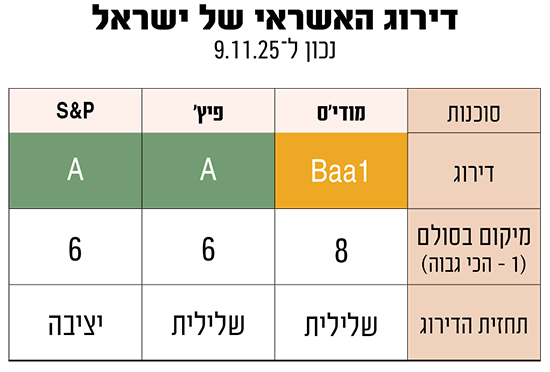 נכון לעכשיו, ישראל בדירוג A (הדירוג השישי בגובהו) לפי סוכנויות S&P ופיץ', ובדירוג Baa1 (הדירוג השמיני בגובהו) לפי מודי'ס. כלומר, בעוד שב־S&P ופיץ' דירוג האשראי של ישראל נמצא בדרגה בינונית גבוהה, מודי'ס שמה אותו בדרגה בינונית נמוכה.