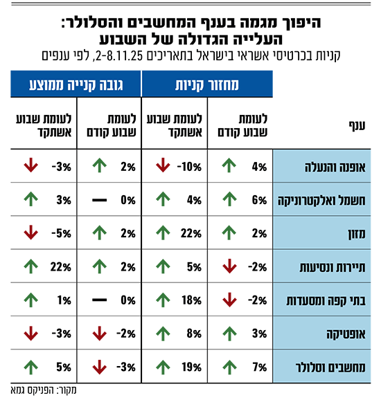 "מנגד, ענפי החשמל והמחשוב הציגו תנועה ערה יותר, במיוחד במרכזים הפתוחים ובחנויות הרחוב. לאחר שבועיים של ירידות במחזורי הקניות, הציבור ביצע השבוע יותר רכישות בכרטיסי אשראי, אך בשוק ישנה ציפייה ותקווה לעליות גבוהות הרבה יותר בהמשך החודש, הודות לימי המבצעים שבדרך - יום הרווקים הסיני, בלאק פריידיי, סייבר מאנדיי ומבצעי סוף השנה".
