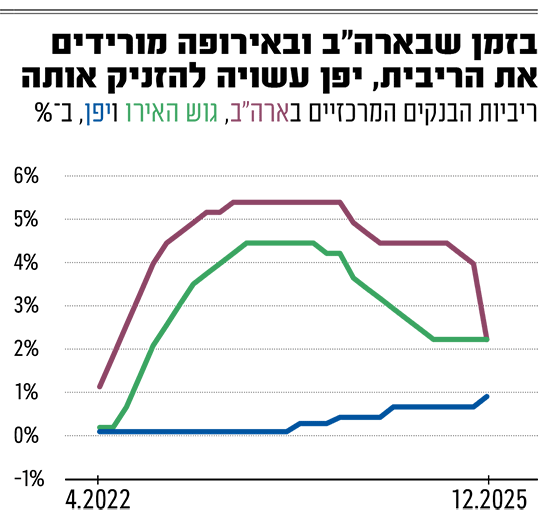 יפן נערכת להעלות את הריבית דווקא כשהעולם מוריד: הבנק המרכזי של המדינה (BoJ) צפוי להעלות את הריבית בדצמבר לרמה של 0.75% מ־0.5% היום, בזמן שהריבית של שאר הבנקים המרכזיים במערב במגמת ירידה. זאת, ברקע המערבולת בה נמצאת הכלכלה הרביעית בגודלה בעולם: המטבע נחלש, החוב תופח, איגרות החוב הממשלתיות בנפילה, התוצר מתכווץ, האינפלציה מסרבת להגיע ליעד, סכנת הסלמה מול סין - ומעל הכול התוכנית הכלכלית הרחבה של הממשלה לתמרוץ הכלכלה.