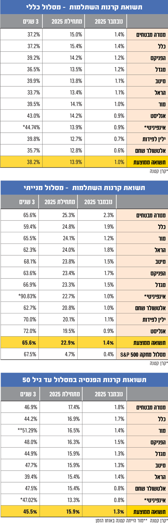 החוסכים בקרנות השתלמות והפנסיה יכולים לחייך אחרי עוד חודש מצוין: החוסכים במסלולים הכלליים נהנו בנובמבר 2025 מתשואה חיובית של כ-1%, ואלה במסלולי המניות מ-1.4%.