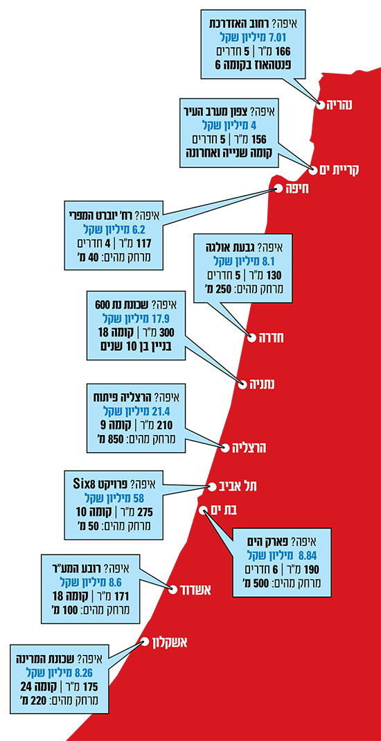 שוק הדירות מצוי בימים אלה בשפל, אך מתברר שרצועת החוף עדיין מספקת עסקאות ברמות גבוהות מאוד של מחירים בנכסים, שחלקם בהחלט מצויים תחת ההגדרה "בלתי־שגרתיים". ברור, שכשמדובר במחירים גבוהים, אין דין נהריה כדין חדרה, אין דין חדרה כדין נתניה, ואין דין נתניה כדין אשקלון. הסקירה כוללת מדגם של עסקאות שבוצעו לאורך חוף הים התיכון, מנהריה שבצפון ועד לאשקלון שבדרום.