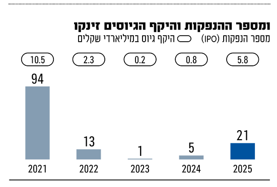 היקף הגיוסים בשוק המניות הסתכם ב־20.5 מיליארד שקל, יותר מכפול מהיקפו ב־2024 (8 מיליארד שקל). כרבע מסכום הגיוסים (5.5 מיליארד שקל) היה בהנפקות הראשוניות לציבור והיתרה על ידי חברות רשומות למסחר או בהקצאות פרטיות.