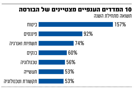 מה עניין את המשקיעים במניות השנה? בראש ובראשונה מניות מתחומי הפיננסים והתעשיות הביטחוניות. שיאנית התשואות (במדד ת"א 125) היתה מניית ארית תעשיות, יצרנית המרעומים לפגזים וחימושים משוטטים, שמנייתה עלתה ב־363% השנה (עד ליום ראשון במהלך המסחר). זאת, לנוכח הגאות בעסקי החברה (הכנסות וצבר ההזמנות), כפועל יוצא של הצטיידות ביטחונית מוגברת ע"י משרד הביטחון ומדינות רבות בעולם בעקבות המלחמות באוקראינה ובישראל.