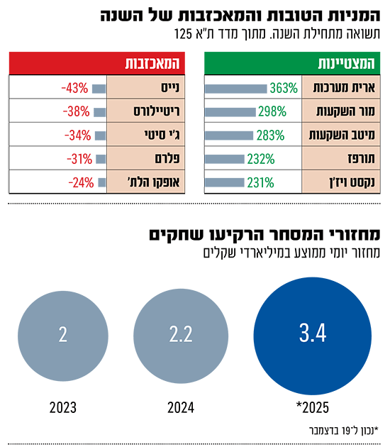 רגע לפני שהבורסה בתל אביב מסיימת עידן ועוברת לשבוע מסחר של ימי שני־שישי, היא פרסמה את סיכום השנה שלה. 2025 הייתה אחת השנים הטובות בתולדות השוק המקומי עם זינוק אדיר במדדי המניות, במחזורי המסחר, במספר ההנפקות הראשוניות ובגיוסי החוב. שנה שהסתיימה עם תשואה פנומנלית של כ־50% במדד הדגל שלה - ת"א 35. הפעם האחרונה שבה הציגה הבורסה תשואה גבוהה יותר הייתה ב־2009, שנת היציאה מהמשבר הכלכלי הגלובלי, אז עלה המדד (שנקרא בזמנו ת"א־25) ב־75%. מאז השפל שאחרי פרוץ מלחמת חרבות ברזל, המדד הכפיל את ערכו.