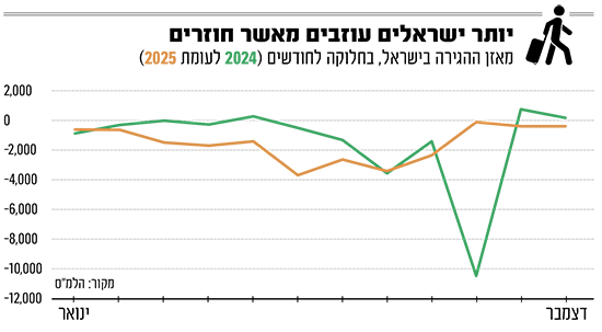 מאחורי הירידה נמצאת הגירה החוצה, שהפכה למשמעותית במיוחד בשנתיים האחרונות: ההגירה נטו לישראל, שהיא בדרך כלל חיובית ונמוכה, הפכה לשלילית למדי בשנים 2025-2024. חשוב להדגיש שמי שנרשם בנתונים כעוזב בשנת 2025 עזב בפועל בשנת 2024, ומוגדר ככזה רק לאחר שהשלים שנה שברובה שהה בחו"ל.