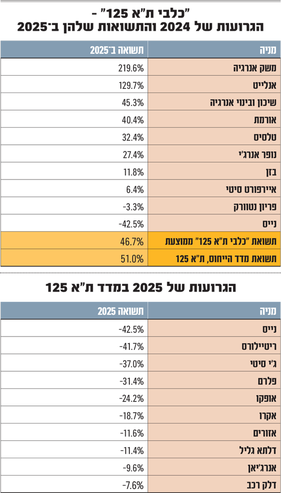 הבולטות ברשימה זו הגיעו מתחום האנרגיה, ובפרט המתחדשת, שהציגו ביצועי חסר ב־2024, אך זכו לרנסנס מפתיע בשנה שעברה: משק אנרגיה, אנלייט, שיכון ובינוי אנרגיה ואורמת.