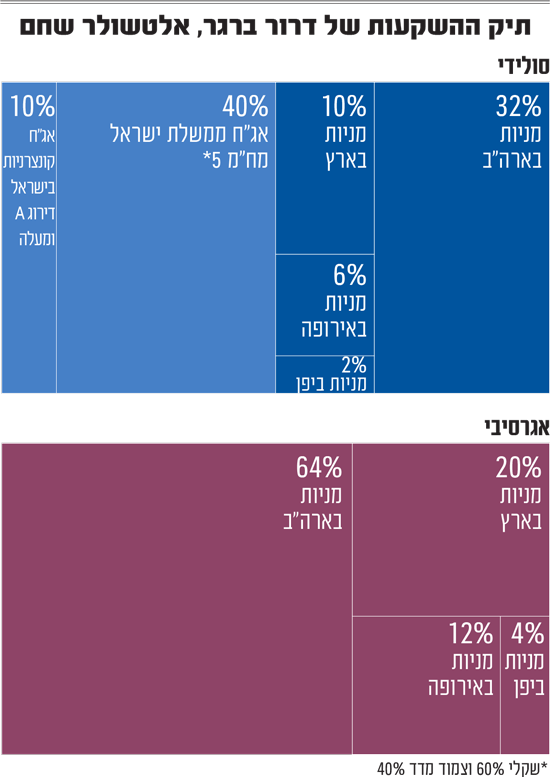 כשאנחנו מבקשים מברגר לבנות תיק השקעות הוא מציע למשקיע סולידי חלוקה של 50% מניות ו־50% אג"ח. ברכיב המנייתי הוא מציע להקצות 10% למניות בישראל, עוד 32% מהתיק למניות בארה"ב, 6% למניות באירופה ו־2% ליפן. לצד אלו, הוא מקצה 40% לאג"ח ממשלת ישראל במח"מ (משך חיים ממוצע) 5 שנים, ואת ה־10% הנותרים לאג"ח קונצרניות בישראל בדירוג A ומעלה.