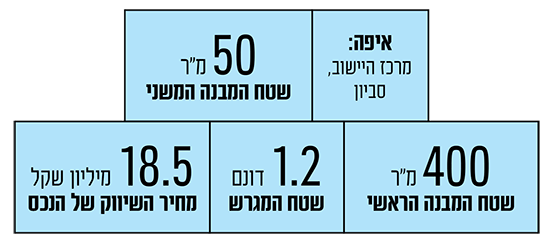 דבר השמאי: "מדובר בנכס ייחודי הממוקם בלב המושבה, באזור הנחשב לאחד המבוקשים ביישוב", אומר השמאי אושרי אהרוני. "שווי הקרקע באזור זה מוערך בכ־11 אלף שקל למ"ר, כך ששווי הקרקע בלבד נאמד בכ־13 מיליון שקל. יתרת התמורה משקפת את שווי המבנים, אשר נבנו בבנייה יקרה יחסית, הכוללת שימוש באבן ירושלמית, קירות עבים ותכנון אדריכלי ייחודי בהשפעה ירושלמית.