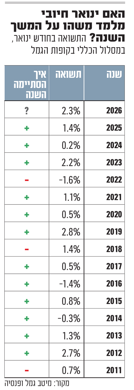 האם חודש ינואר יכול ללמד משהו על המשך השנה? אם בוחנים את התשואה בגמל ובהשתלמות של חודשי ינואר מאז שנת 2011 ועד אשתקד, היא הייתה חיובית ב־12 מתוך אותן 15 שנים עם תשואה ממוצעת של 0.8%. בתוך השנים הללו, היו שלוש שנים שבהן נרשמה תשואה חיובית של יותר מ־2% בחודש ינואר (בשנים 2012, 2019 ו־2023). כל שלוש השנים הללו הסתיימו בתשואה חיובית חזקה מאוד לחוסכים (9.4% עד 12.5%).