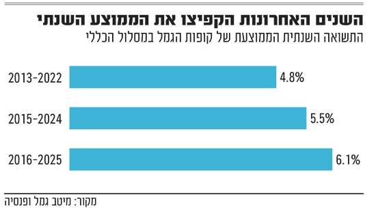 על פי נתונים שאסף אבי ברקוביץ, המשנה למנהל השקעות ראשי מיטב גמל ופנסיה, בעוד שבשנים 2013-2022 הממוצע הרב שנתי במסלול הכללי של קופות הגמל עמד על 4.8% לשנה, הממוצע עלה בשנים 2015-2024 ל־5.5%; ובשנה שעברה הוא כבר הגיע ל־6.1%. כלומר זינוק של 1.3% בממוצע הרב שנתי בשנים האחרונות.