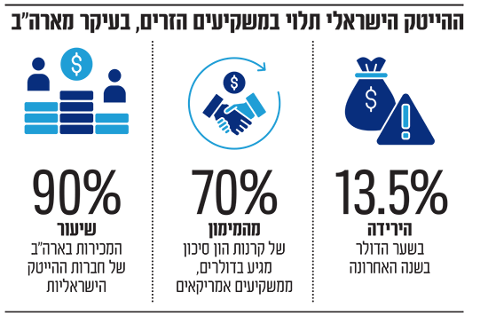 תוכניות ממשלתיות למשוך מוסדיים ישראלים להשקיע בקרנות הון סיכון עדיין לא באו לידי ביטוי, חלקן (כמו תוכנית "סעיף 43") בוטלו, כך שההון הישראלי המושקע בקרנות ישראליות ובחברות הייטק שאינן נסחרות - נותר מוגבל למדי. פעמים רבות, בעיקר בחברות הבוגרות יותר ובחברות הנסחרות בנאסד"ק, ההכנסות הן דולריות בלאו הכי מאחר שארה"ב מהווה את שוק היעד העיקרי של מרביתן. שיעור המכירות בארה"ב מכלל שוקי היעד של חברות ההייטק הישראליות גבוה מ־90%.