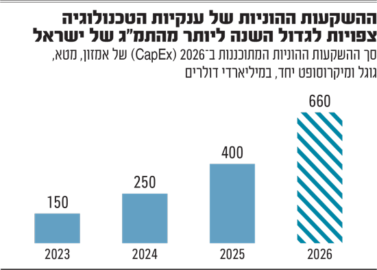 להמחשה, בסוף השבוע הפתיעה אמזון עם הגדלת השקעותיה ב-2026 ביותר מ-50% ל-200 מיליארד דולר, בעוד גוגל הכריזה על הכפלת השקעותיה ב-AI לכ-185 מיליארד דולר. גם מטא הודיעה על השקעה של 135 מיליארד דולר, יותר מכפול ביחס ל-2025. מיקרוסופט צפויה להשקיע השנה 140 מיליארד דולר.