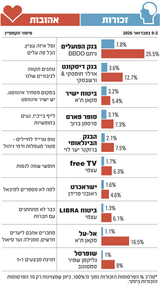 המשרדים האחראים לשלוש הפרסומות האהובות ביותר הם גיתם BBDO (בנק הפועלים), מקאן ת"א (אל על) ואדלר חומסקי & ורשבסקי (בנק דיסקונט)