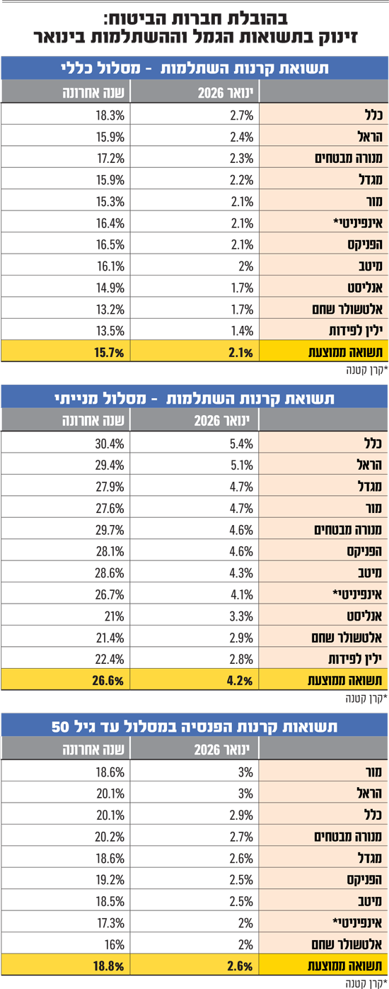 המגמה מהשנה החולפת נמשכה אל תוך שנת 2026, כשגם בחודש ינואר היו אלה חברות הביטוח שכבשו את ראש טבלת התשואות. ברקע, החשיפה הגדולה יחסית להשקעות בשוק המניות המקומי, שכאמור עלה בחדות, לעומת בתי ההשקעות.
