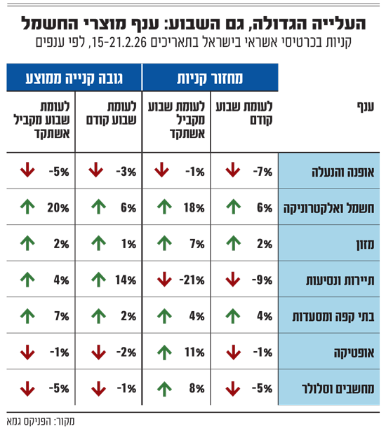 שבוע הרכישות של הישראלים התאפיין במגמה מעורבת, כאשר חלק מענפי הצרכנות הבולטים המשיכו לרשום עליות, בזמן שאחרים ביצעו "תיקון" אחרי העליות שנרשמו בעקבות הולנטיינ'ס דיי - כך עולה ממדד הפניקס גמא, הבוחן את פעילות כרטיסי האשראי והתנהגות הצרכנים בענפי הקמעונאות בישראל.