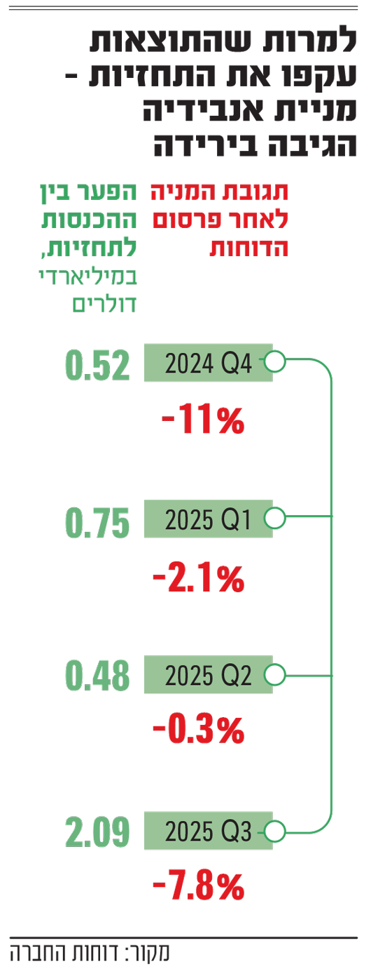 "לכן, אפשר להבין משקיעים שמגוונים את סלי ההשקעה שלהם עם מדדים שבהם המשקל של אנבידיה מאוזן יותר גם עם זה של חברות שבבים אחרות. ככל שרף הציפיות הוא יותר נמוך לקראת שיחת המשקיעים ברביעי בלילה, כך שינוי המגמה עשוי להיות קיצוני יותר אם מנכ"ל החברה יפתיע לטובה במהלכה".