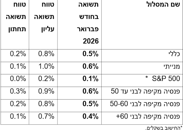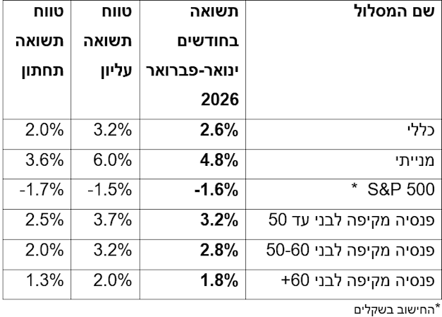 כאמור מתחילת שנת 2026, תחזית מיטב היא לתשואה חיובית של 2.6%, כאשר יש טווח רחב יותר בין התשואות של המסלולים. כך למשל המסלול המנייתי עם תשואה של 4.8% בינואר-פברואר, בעוד שמסלול S&P 500 בחישוב שקלי עם תשואה שלילית של 1.6%.