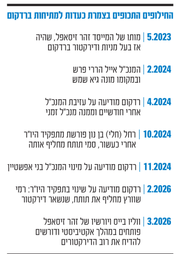 נזכיר כי ב-2024 היה אירוע תמוה בחברה (בעת כהונת בן נון כיו"רית): עם פרישת המנכ"ל דאז אייל הררי (כיום מנכ"ל אלוט), החברה הודיעה על מינוי גיא שמש לתפקיד. אלא שאחרי חודשיים בלבד רדקום הודיעה במפתיע על עזיבתו, שנומקה בסיבות אישיות, ומינתה מנכ"ל זמני. מתברר כעת שבעל מניות ברדקום כעס על המהלך וביקש להתניע מהלך אקטיביסטי ולהדיח את כל חברי הדירקטוריון. אולם לבסוף הוסכם על פשרה וכן על צירוף ריפשטיין ותותח לדירקטוריון, האחרון כיו"ר.