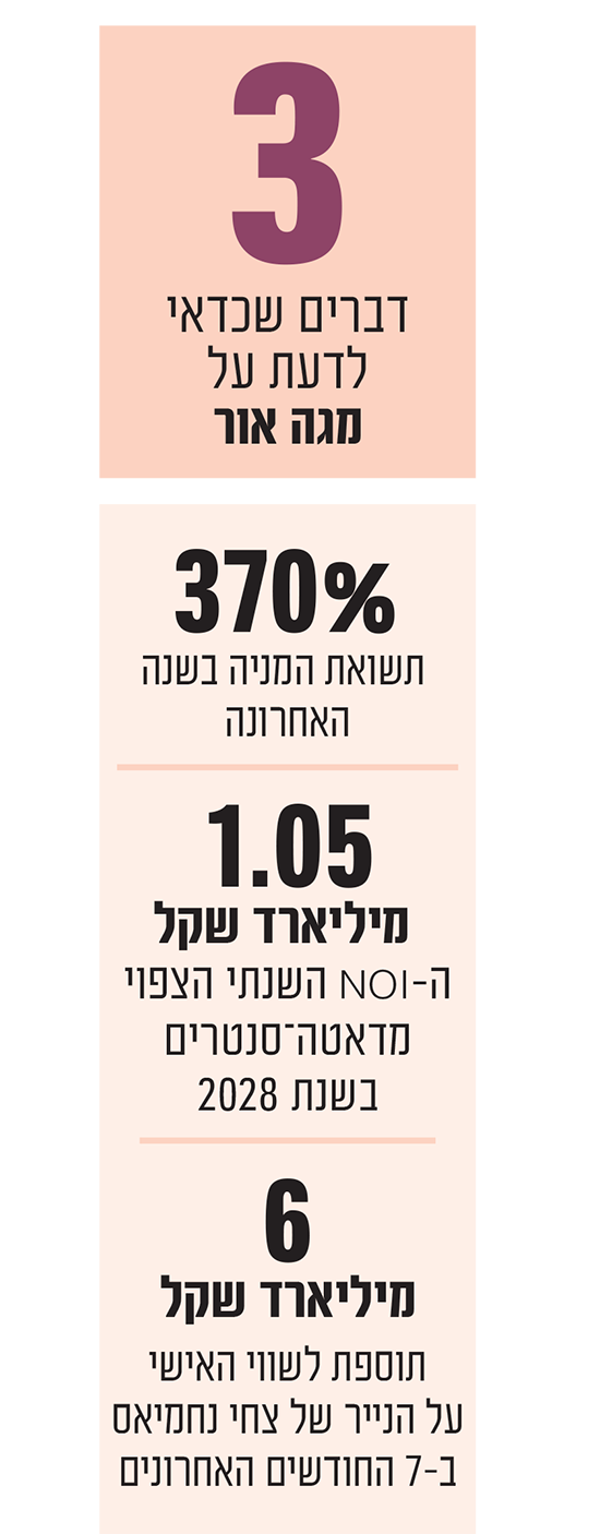 החוזים הללו, משנים לחלוטין את מודל ה־NOI (הכנסה תפעולית נטו) של מגה אור. אם בשנת 2025 תחום הדאטה סנטרים תרם כ־38 מיליון שקל בלבד ל־NOI, תחזיות החברה מדברות על קפיצה ל־500 מיליון שקל ב־2027, ועד ל־1.05 מיליארד שקל ב-2028 (שיהוו כ-65% מההכנסות).